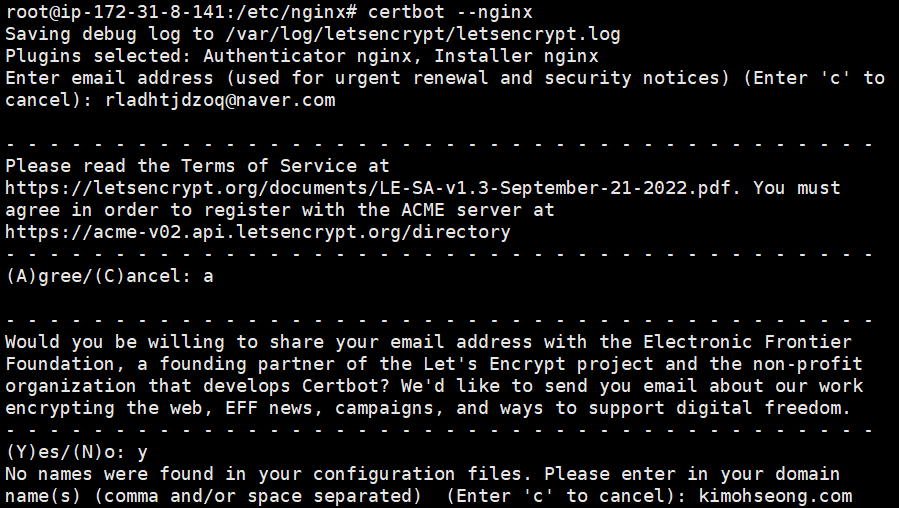 certbot --nginx 후 default.conf를 확인하면 certbot이 ssl에 필요한 정보들을 자동으로 입력해준다.