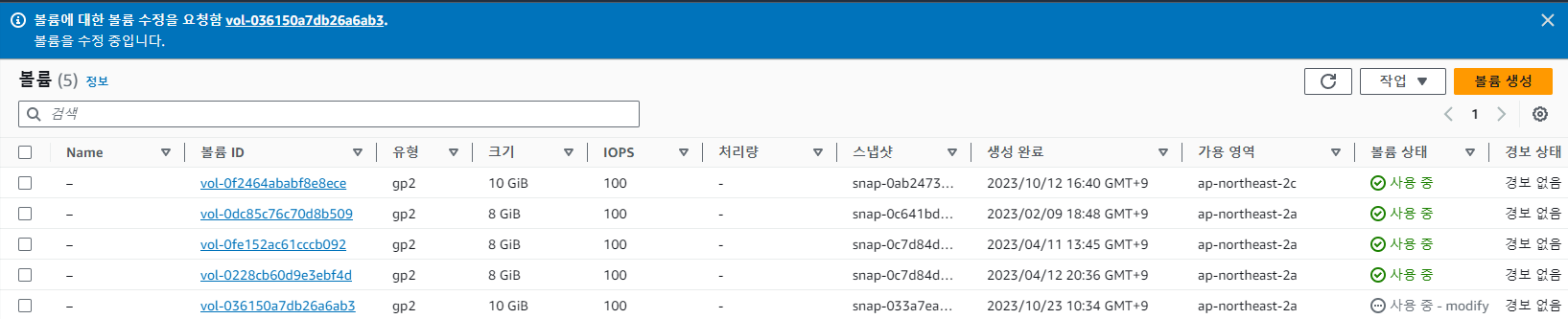 일정 시간 기다리면 크기가 10 > 20 GB로 변경 됐고, 사용 중으로 표시된다.