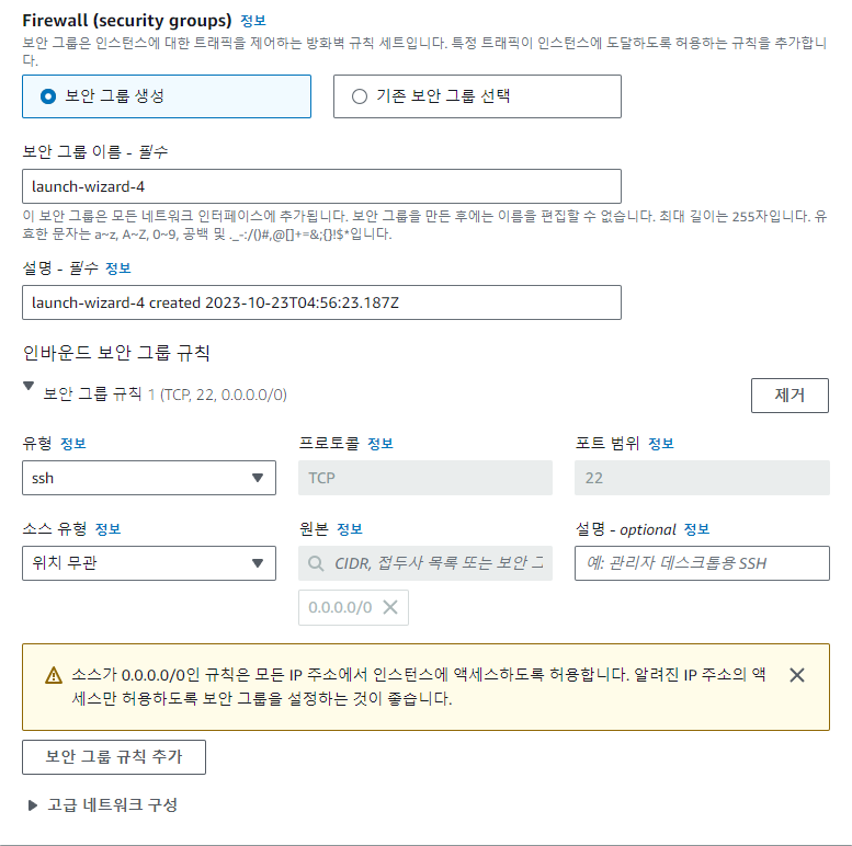 보안 그룹이 이미 있다면 기존 보안 그룹에서 선택