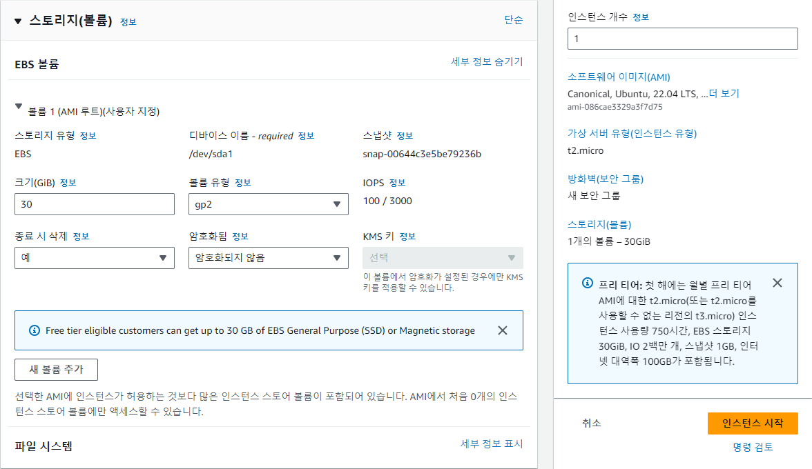 EBS 볼륨크기는 30GB 이하로 알맞게 설정한다.
