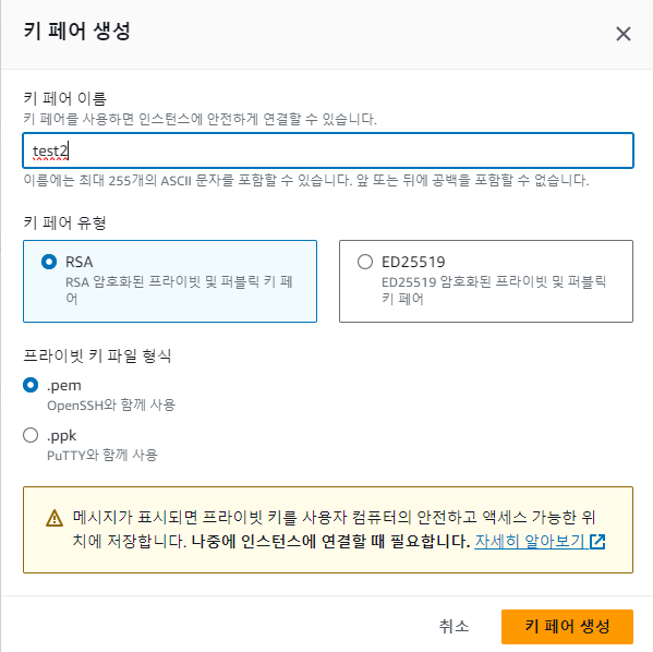 없다면 새 키 페어 생성