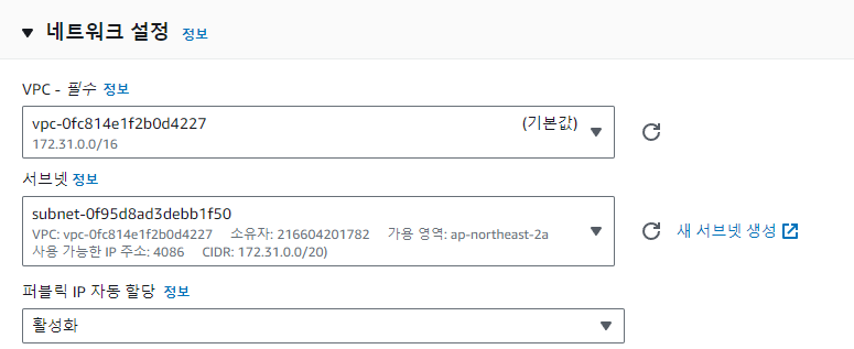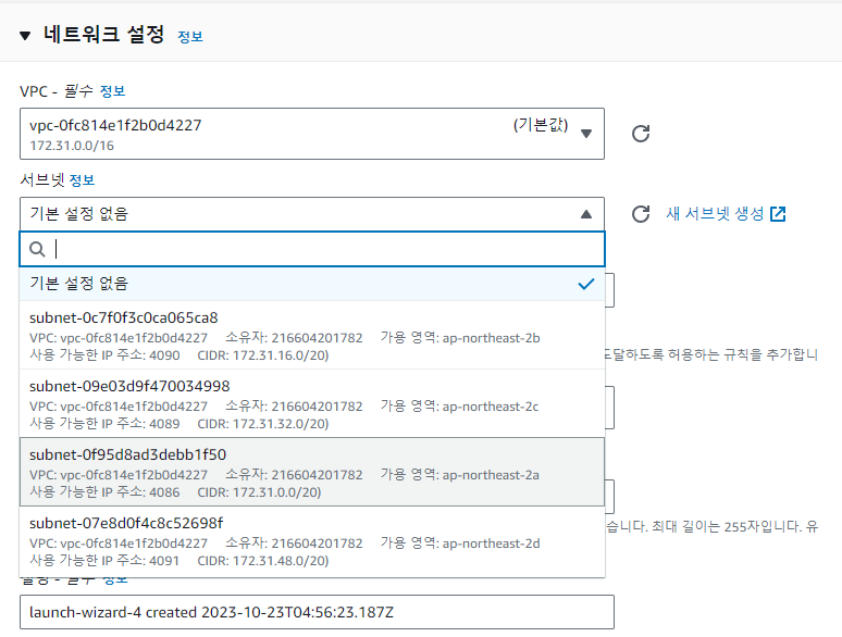 VPC 선택 > 서브넷 선택 여기선 ap-northeast-2a