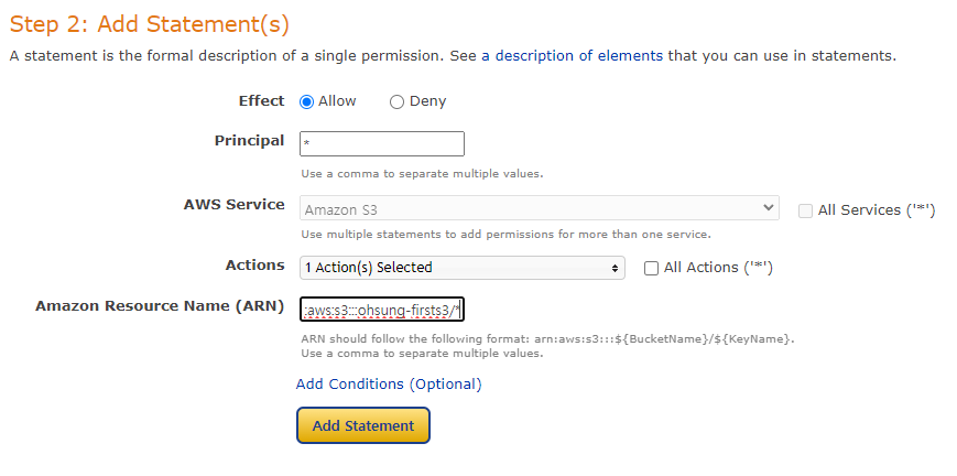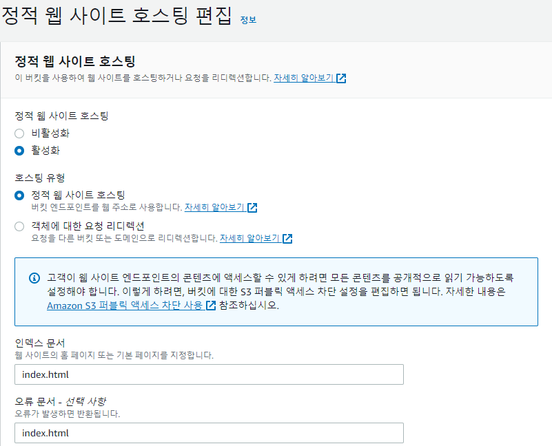 도메인을 사용할 것이라면, naver.com 이런식으로 www를 제외한 .com or .net 까지 도메인명으로 버킷이름을 만들어야 한다.