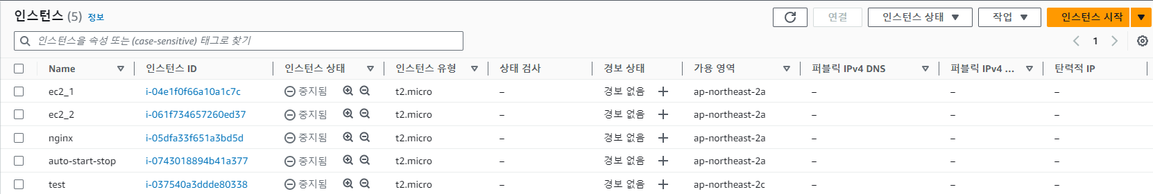 먼저 test, auto-start-stop 인스턴스 모두 종료