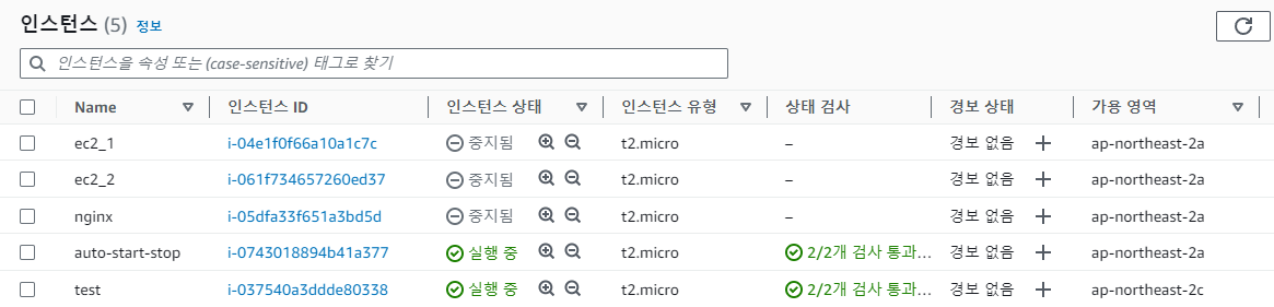 스크립트 실행 결과 test 인스턴스만 실행된 것 확인