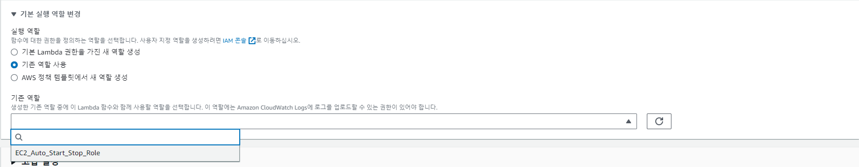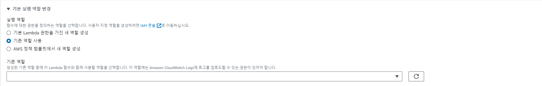 기본 실행 역할 변경 > 기존 역할 사용