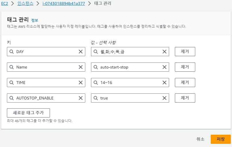 인스턴스 ID 클릭 > 태그 > 태그 관리