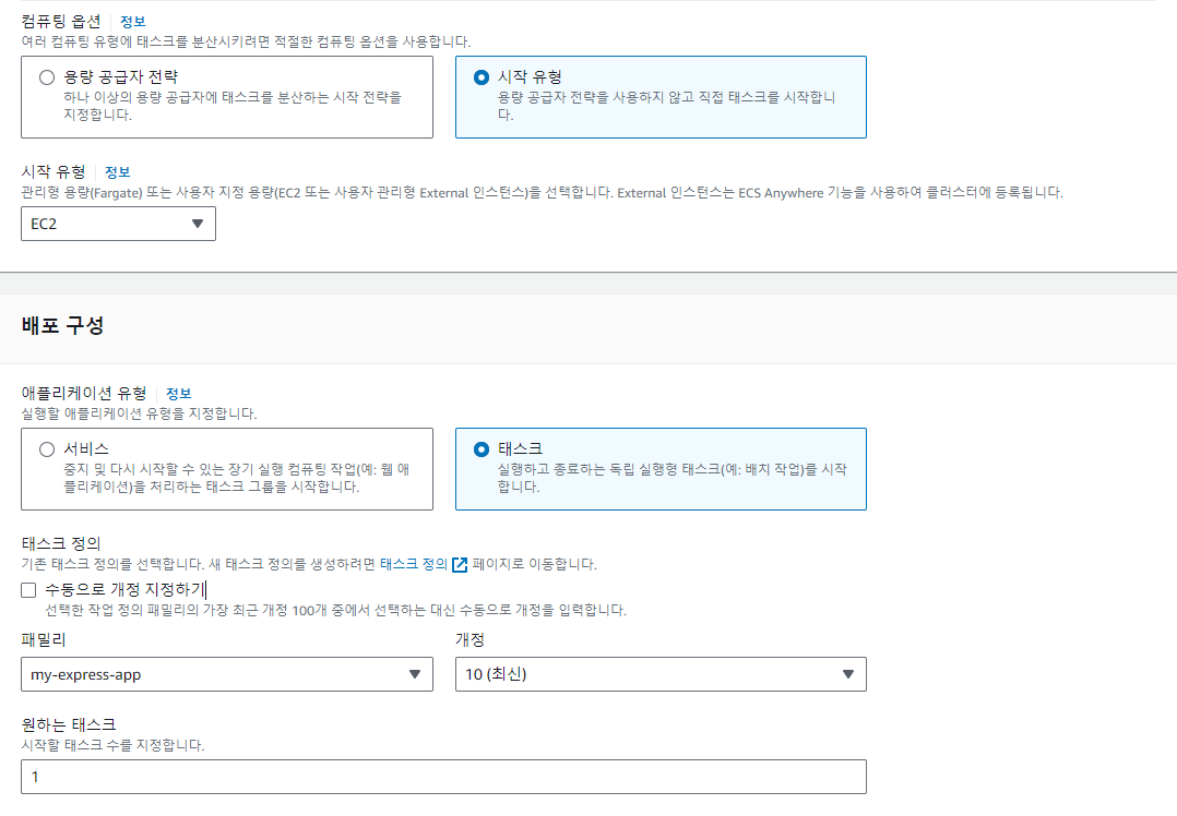 - Task definition에서 정의한 패밀리와 시작유형을 EC2로 지정합니다.