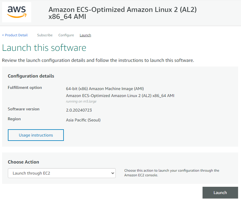 - EC2 인스턴스를 시작할 때, ECS-optimized Amazon Linux 2 AMI를 선택하여 인스턴스를 생성합니다.