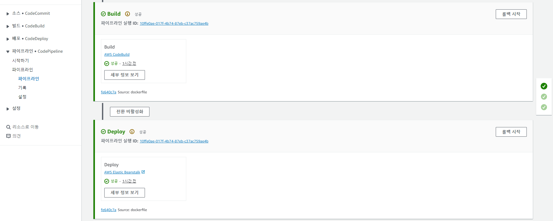 파이프라인이 실행될 때마다 AWS 콘솔에서 파이프라인의 상태를 실시간으로 모니터링할 수 있습니다.