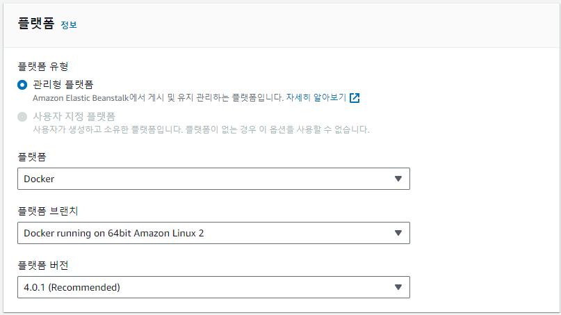 - 플랫폼 브랜치: Docker running on 64bit Amazon Linux2