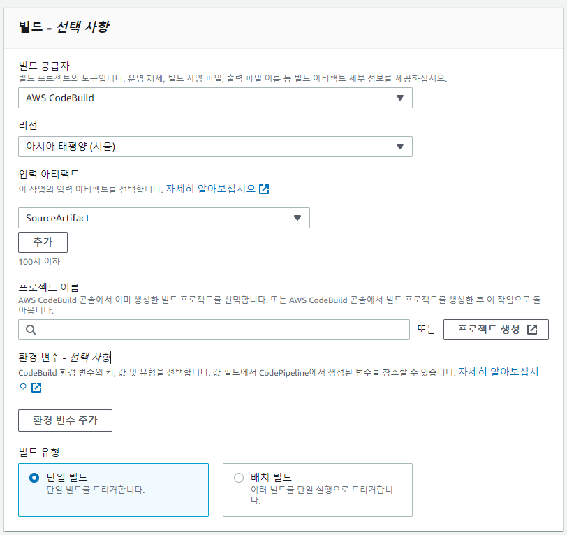 - 빌드 공급자: AWS CodeBuild를 선택합니다.