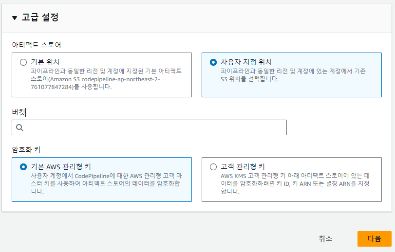 - 고급 설정: code build 단계에서 생성한 S3 버킷을 지정합니다.