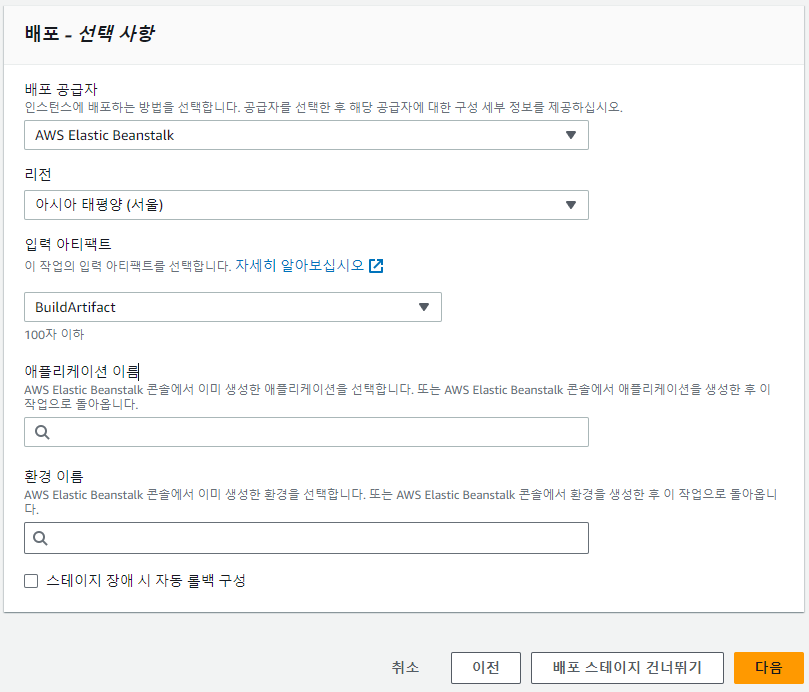 - 배포 공급자: Amazon Elastic Beanstalk를 선택합니다.