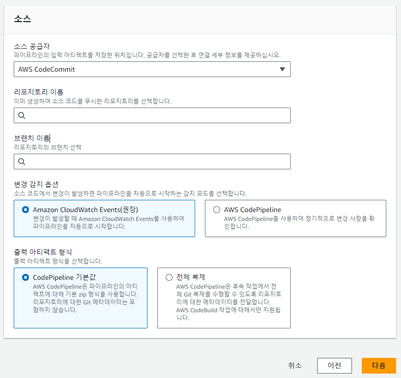 - 소스 공급자: AWS CodeCommit을 선택합니다.