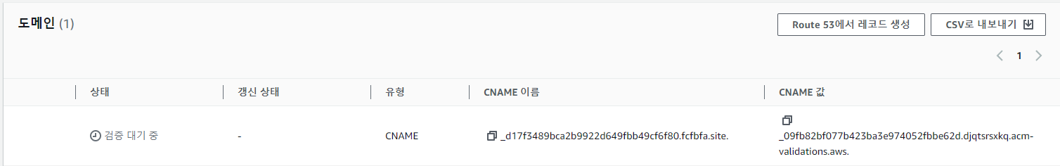 - ACM에서 Route 53에서 레코드를 생성 시 CNAME 유형으로 인증서 설정 레코드가 생성됩니다.