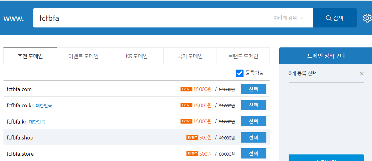- 사용 가능한 도메인을 선택하고 장바구니에 담기 버튼을 클릭합니다.
