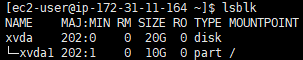 lsblk 명령어로 20G 확인 및 디스크 유형 확인 (xvda or nvme)